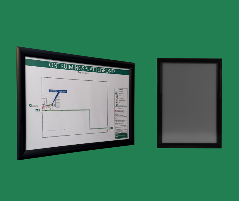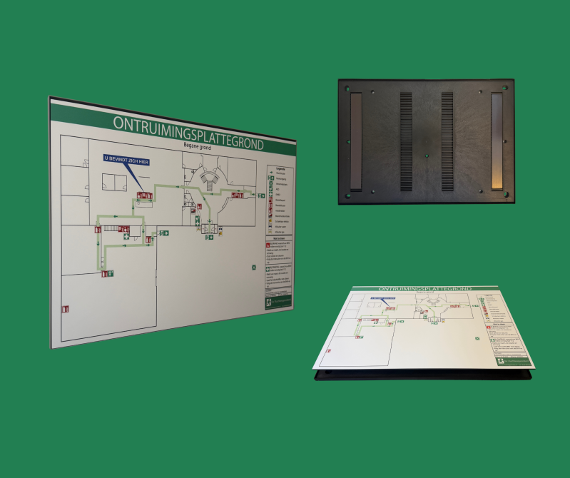 Voor de montage van ontruimingsplattegronden zijn er diverse oplossingen. Denk hierbij aan de standaard kliklijst of het laten bedrukken op palboard. Hieronder een overzicht van onze oplossingen voor het perfect zichtbaar ophangen van de ontruimingsplattegrond.